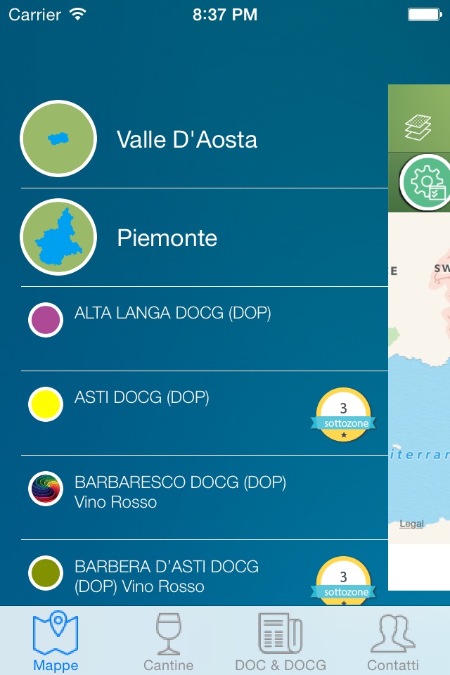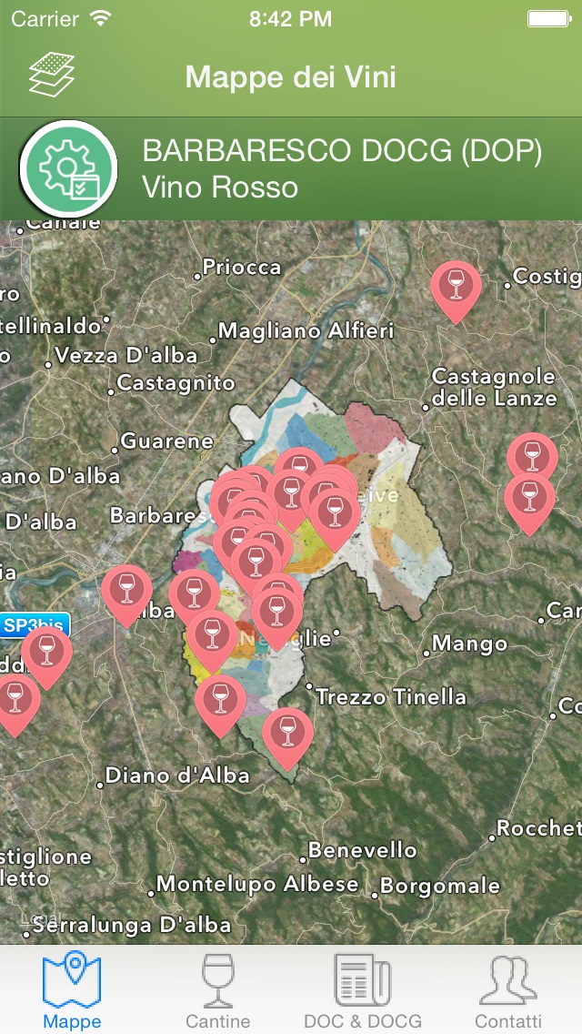 L'applicazione contiene tutte le mappe delle DOCG (DOP) e delle DOC (DOP) del vino italiano geo referenziate con la cartografia dello Smartphone in modo dinamico e interattivo. All'interno di queste vengono evidenziate le sottozone, le aree classico e le specifiche aree di produzione ove presenti.